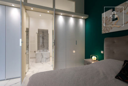 The apartment is furnished and fully equipped, including air conditioning and an alarm system. Most of the built-in furniture and appliances are of Italian origin, reflecting high-quality craftsmanship. The building has an elevator.