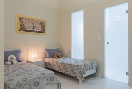 The property has three bedrooms, each with its own bathroom (two with showers, one with a bathtub). The living room and the kitchen with dining area are in separate rooms. There is also an entrance hall and a study. The ceiling height is 4.5 meters – a true rarity.